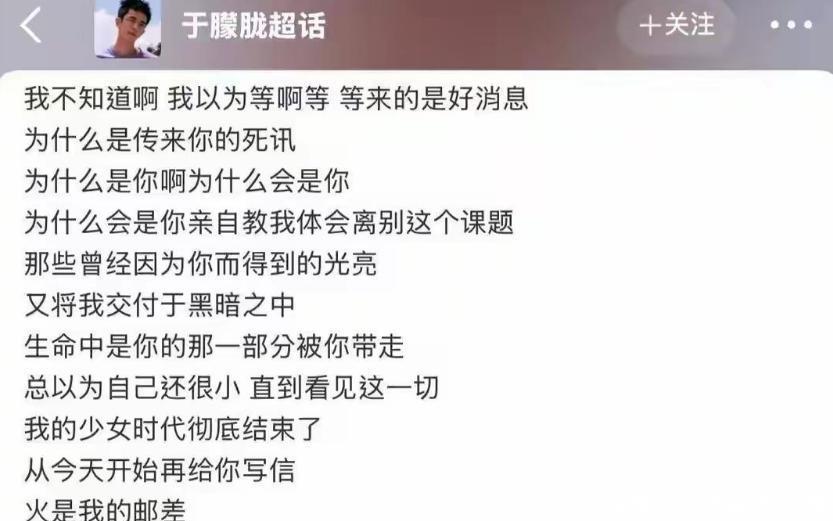 當(dāng)年的兄弟們也表達(dá)了自己的悲傷,尤其是華晨宇,兩人的感情如同相見恨晚的朋友一樣,當(dāng)初于朦朧被淘汰的時(shí)候,他就抱著哭,兩人的感情都不能說是朋友,更像是兄弟一樣,然而現(xiàn)在,兩人沒有了再相見的機(jī)會(huì)了。
